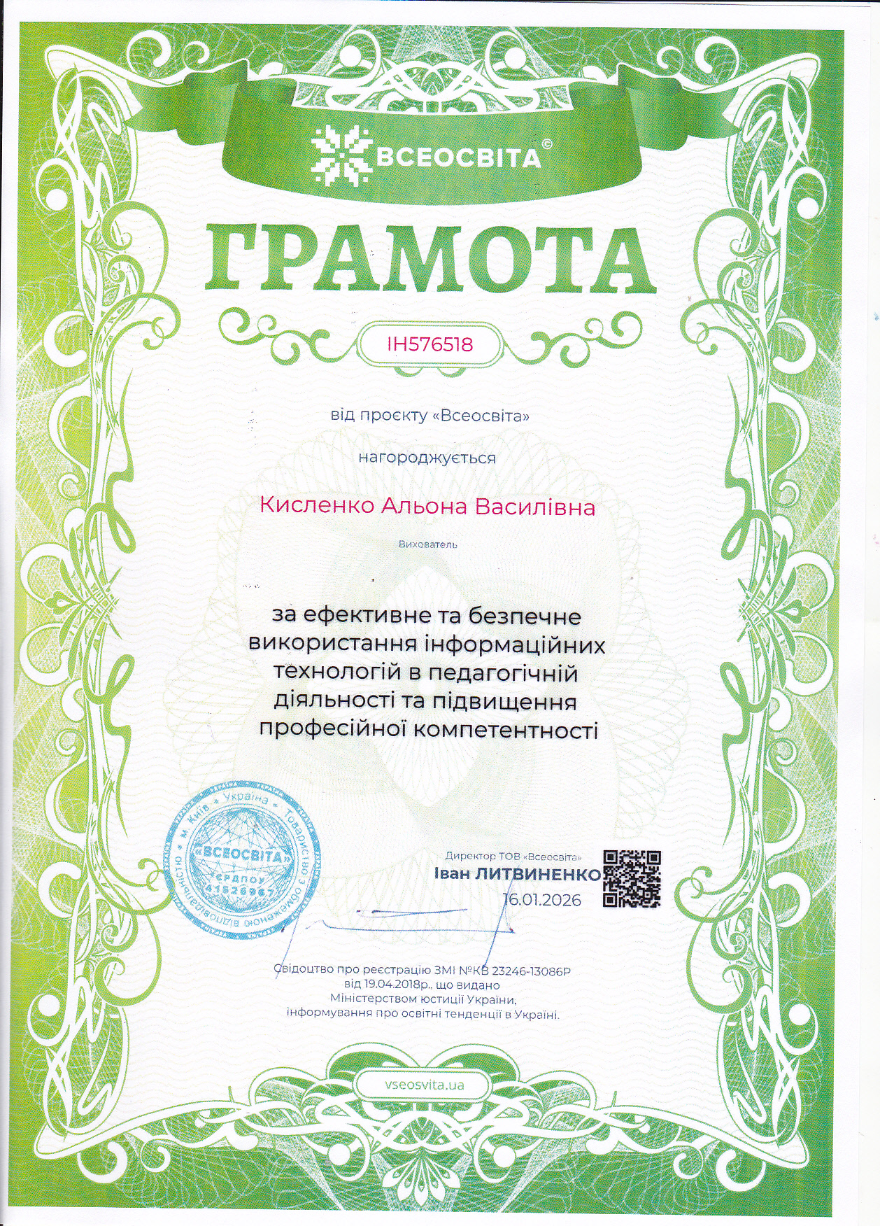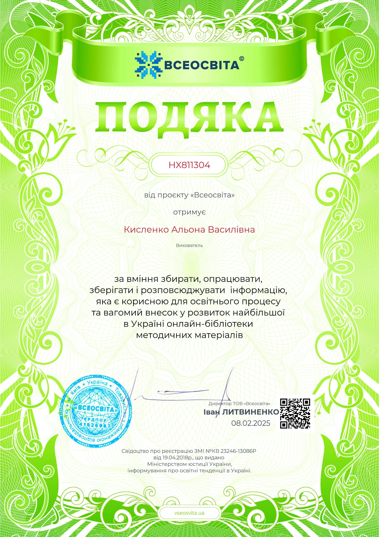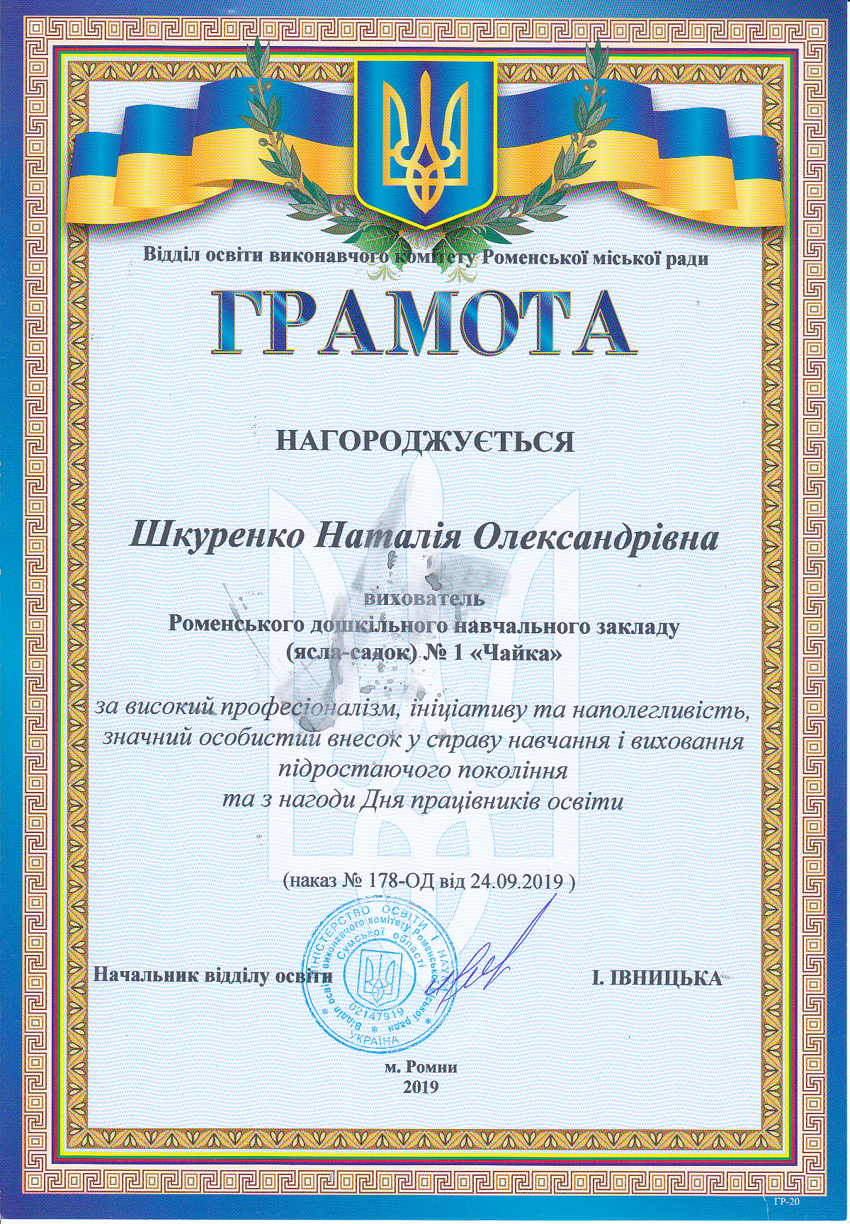 Керує закладом досвідчений працівник галузі дошкільної освіти, Відмінник освіти України Михайличенко Ліна Федорівна. Вся її життєва і творча біографія пов’язана з дошкіллям.
